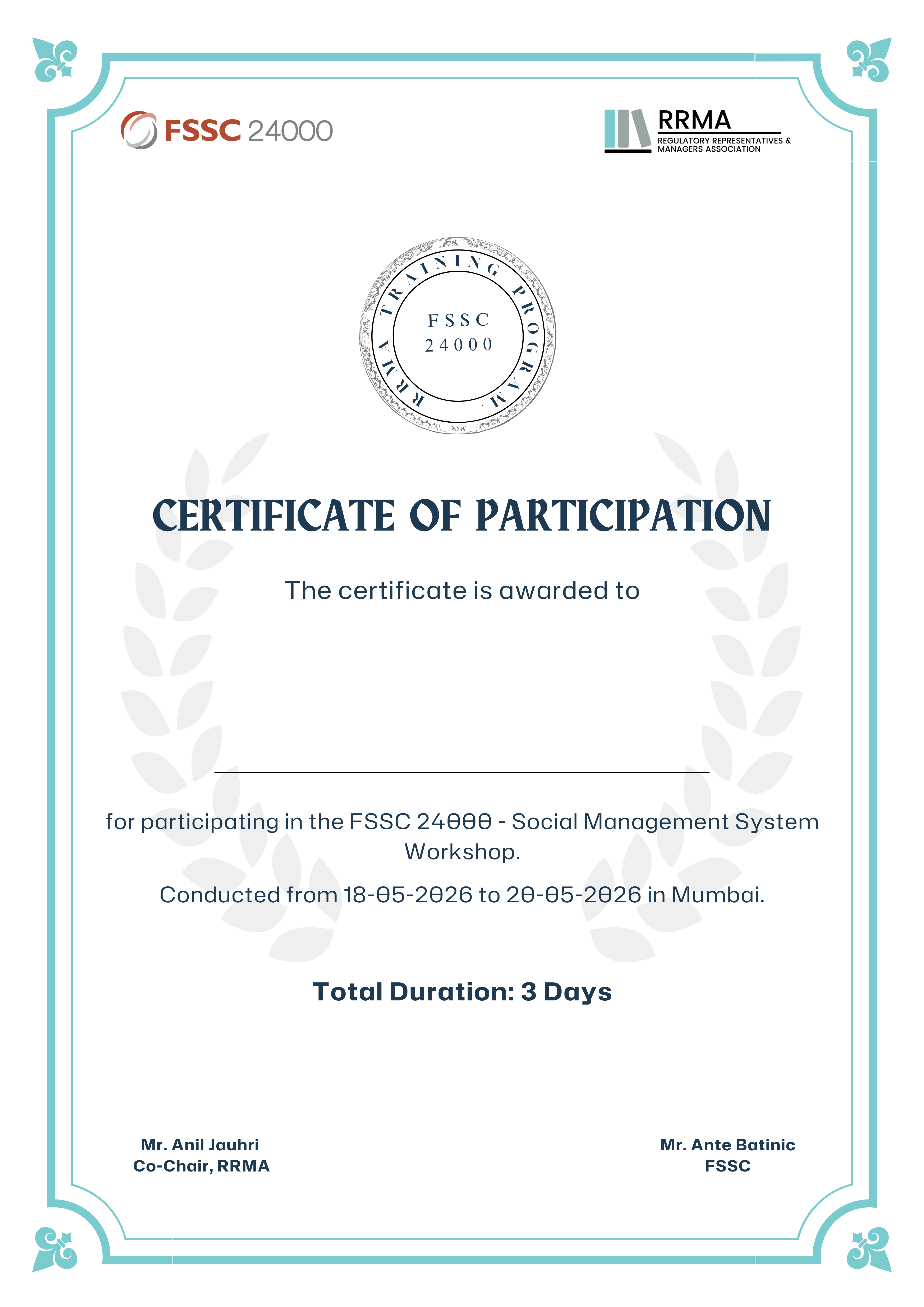 RRMA is organizing this specialized training program for industry professionals and consultants to enhance their understanding of FSSC 24000, the Social Management System Scheme developed by FSSC.